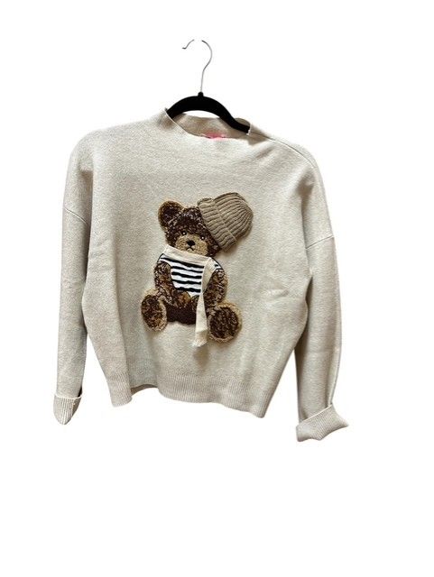 Cozy meets playful in this semi-thick mock neck sweater. Featuring a soft knit and a teddy bear design on the front. Relaxed fit. It sits right above the pant line, offering a flattering length that’s neither cropped nor long. Finished with your choice of cuffed or uncuffed sleeves. One size fits most, designed to flatter sizes small through large.